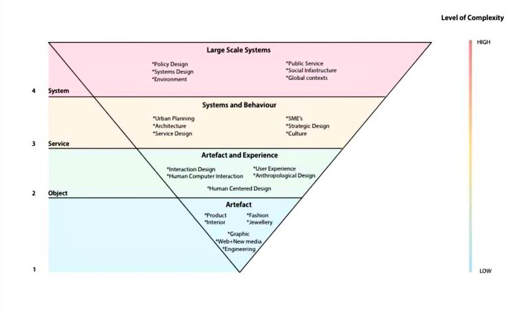 Similarly to Buchanan, Stefanie Di Russo (2016) has produced the following categorisation of design practices according to the level of complexity of their outputs, from object design, to service design to system design, practices to which design thinking can be and has been applied: