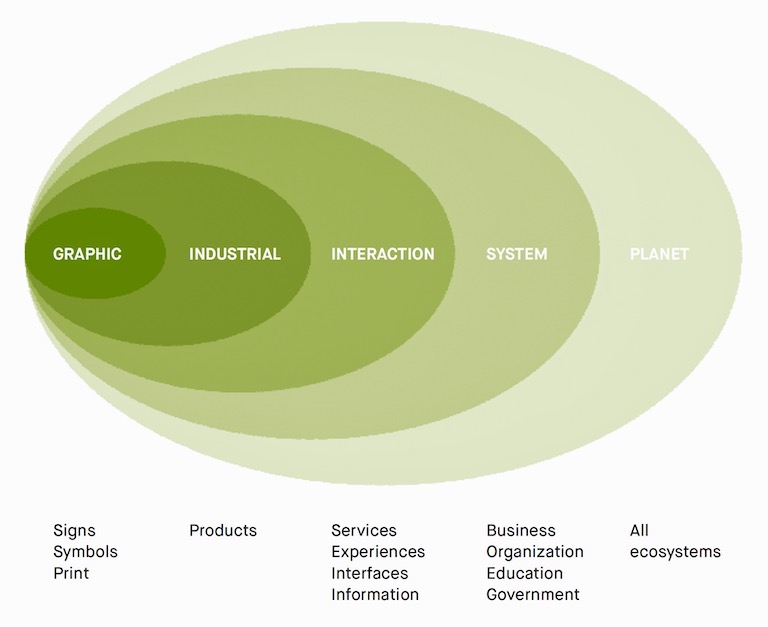 This historical development and expansion of design practices has been charactered as having four orders or dimensions by Richard Buchanan (2001), articulating, to different degrees, symbols, things, action and thought: